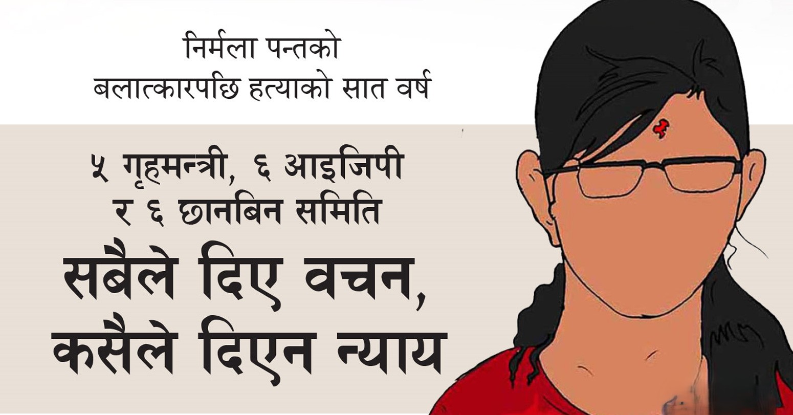 कञ्चनपुरकी १३ वर्षीया बालिका निर्मला पन्तको बलात्कारपछि हत्या भएको सात वर्ष पुगेको छ । तर, दोषी अझै कानुनी कठघराबाहिरै छन् । पछिल्लो सात वर्षमा पाँच गृहमन्त्री फेरिए भने ६ जना प्रहरी महानिरीक्षक बदलिए । तर, न्यायको पर्खाइमा उभिएको निर्मलाको परिवार आस मार्दै छ ।