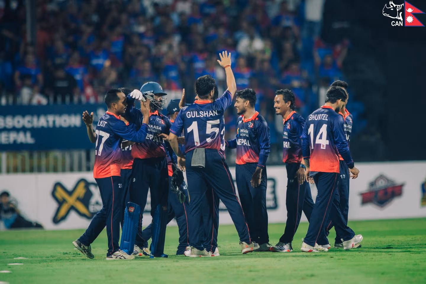 नेपालका लागि कप्तान रोहित पौडेलले ३५ बलमा ३ चौका र १ छक्कासहित सर्वाधिक ३८ रन बनाए । कुशल मल्लले २१ बलमा २ चौका र २ छक्कासहित ३० रन बनाए । गुल्शन झाले २२ रन बनाए । दीपेन्द्रसिंह ऐरीले १७ रन बनाए ।